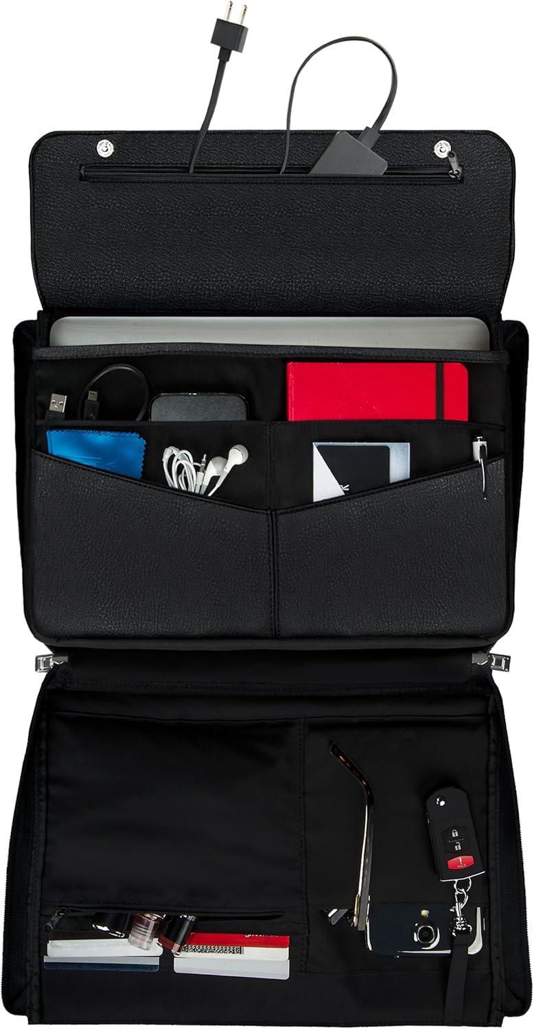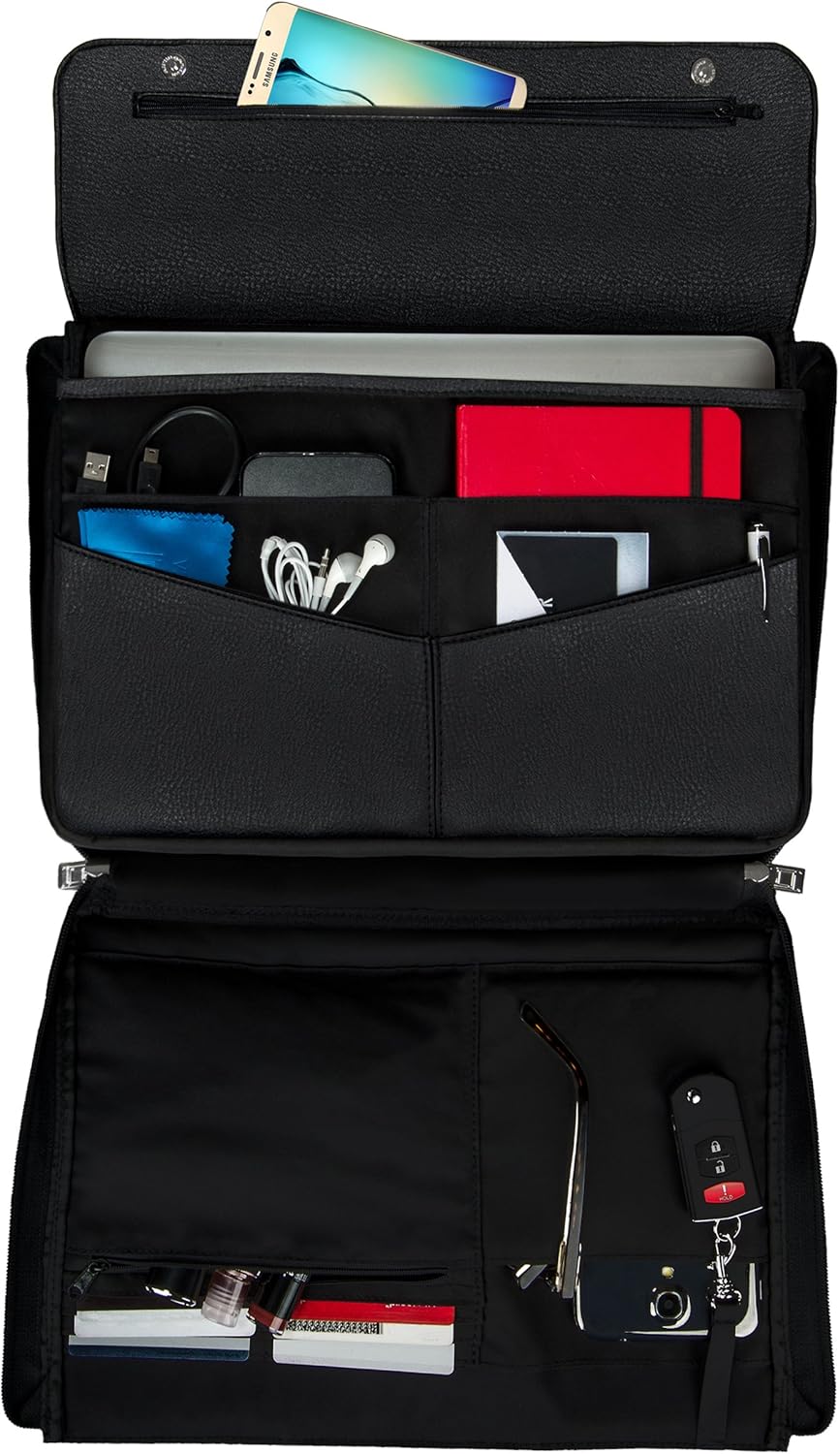 INTERIOR APPOINTMENTS, INCLUDED ADJUSTABLE REMOVABLE SHOULDER STRAP: The portfolio organizer like layout features 6 card slots, 1 small zippered pocket, 1 key fob holder, 1 cell phone compartment, 4 large slip pockets for larger items and accessories, and 1 laptop compartment. Included is an adjustable padded shoulder strap for shoulder or crossbody wear; you can also remove the strap and pack away the bag into your carry-on luggage as a laptop sleeve.