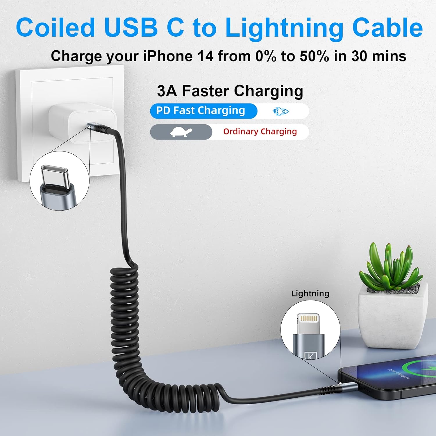 MFi Certified Coiled Lightning Cable and Fast Charging: Apple MFi certified lightning charger cable meets all Apple standards with transfer speeds up to 480Mb/s and 3A fast charging.