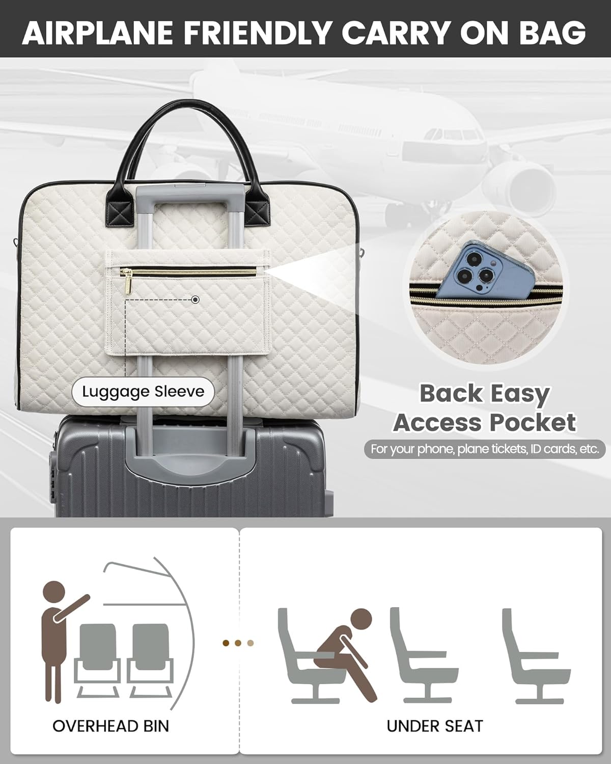 【STYLISH & PRACTICAL CARRY ON BAGS FOR AIRPLANES】This combines elegance and practicality, perfectly meeting the modern urban woman’s travel needs. Its diamond-quilted polyester body and leather accents offer a chic look with lasting durability. The duffle bag features a detachable & adjustable shoulder strap for satchel or cross body style, and sturdy, rounded handles for easy hand carrying. Its upright design ensures your belongings stay secure and accessible